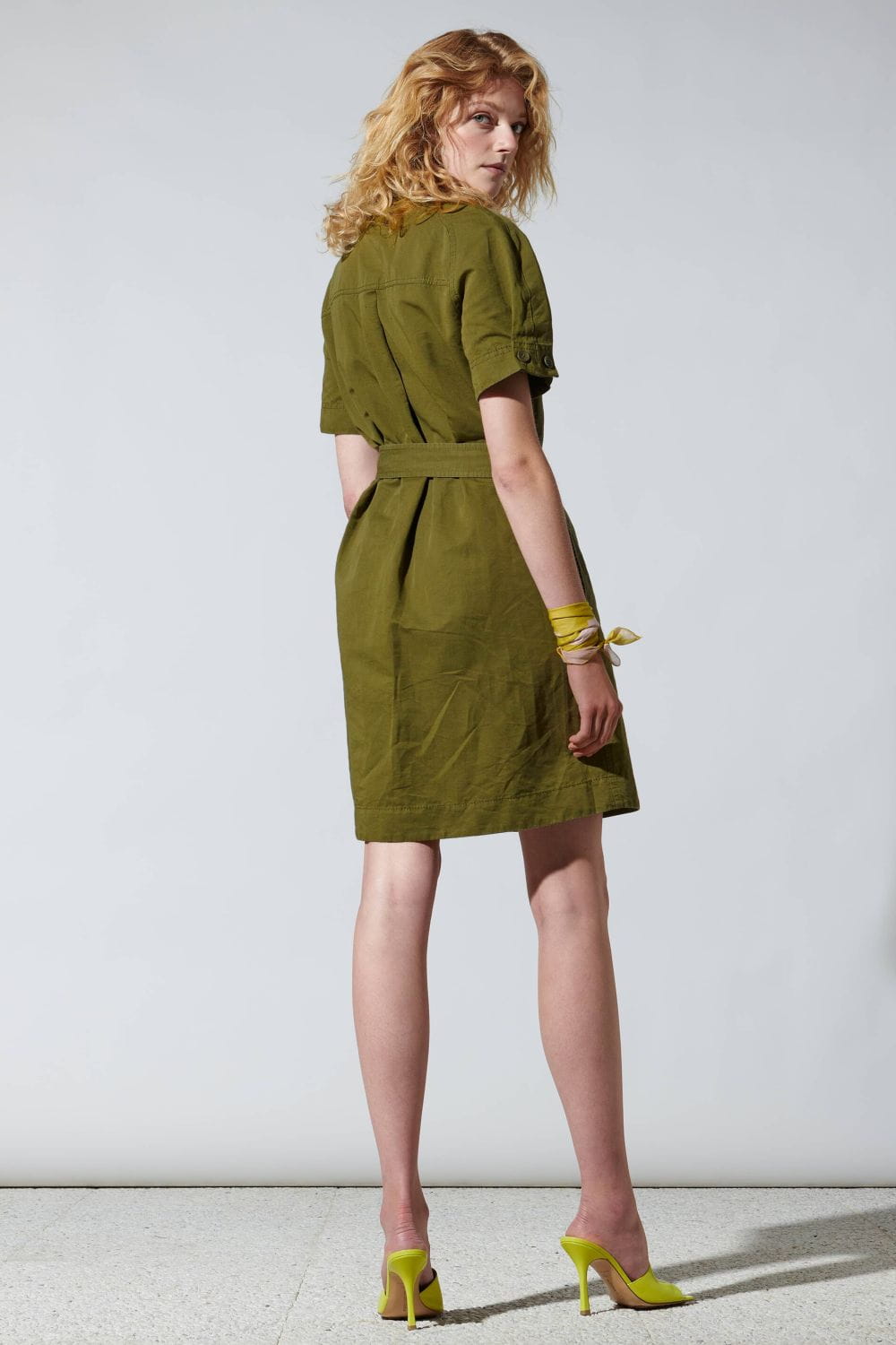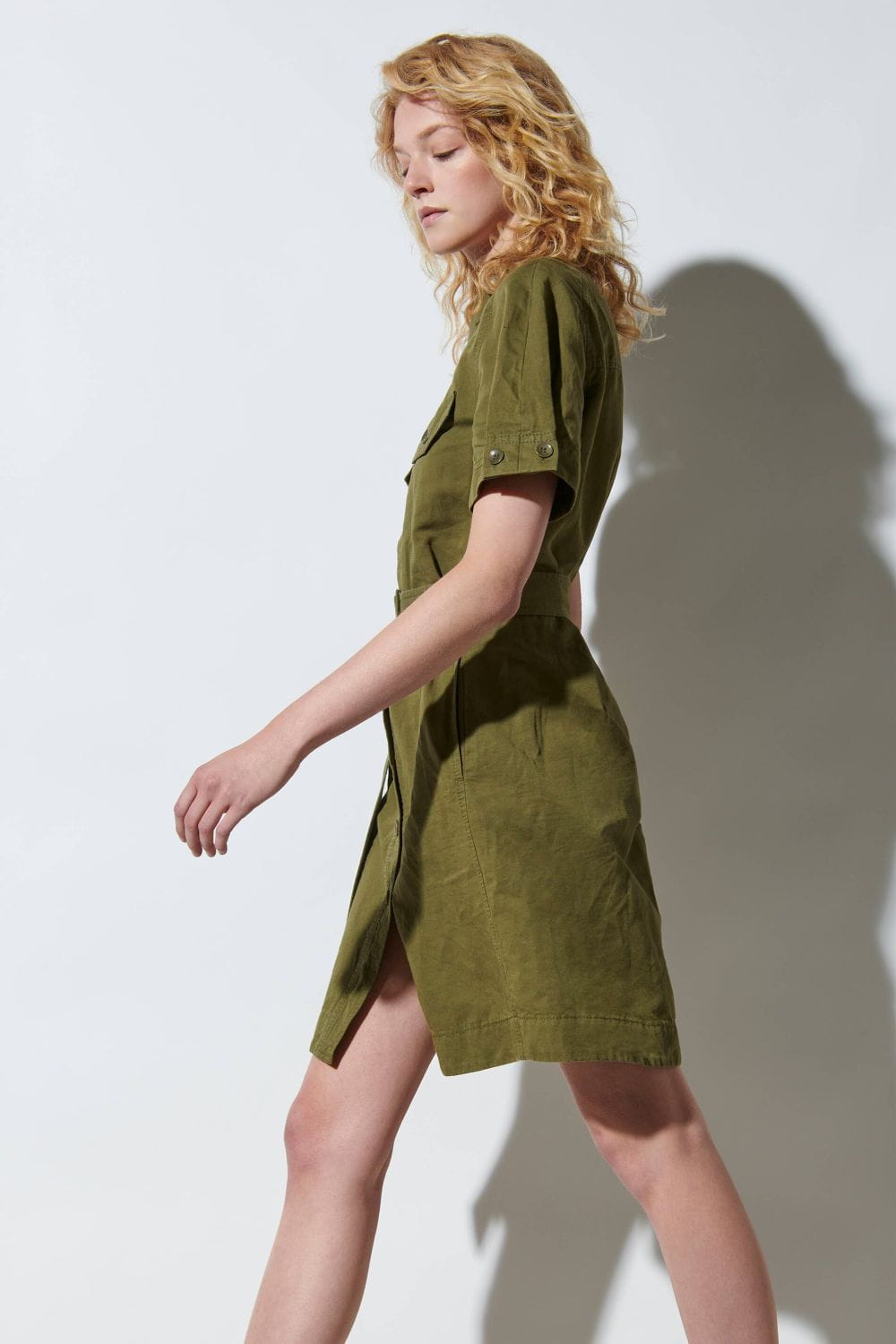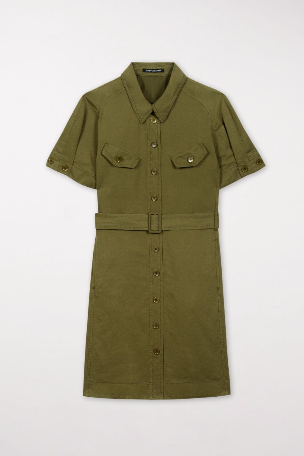 Sportowa, lniano-bawełniana mini sukienka od Luisy Cerano w kolorze khaki z materiału typu gabardyna. Sukienka ma krótkie rękawy, kołnierzyk w stylu koszulowym oraz dopasowany kolorystycznie pasek z klamrą. Przód sukienki jest zapinany na całej długości za pomocą guzików, a na piersi znajdują się dwie klapy z guzikami. To idealna propozycja dla tych, którzy łączą wygodę ze sportowym stylem w swojej garderobie.