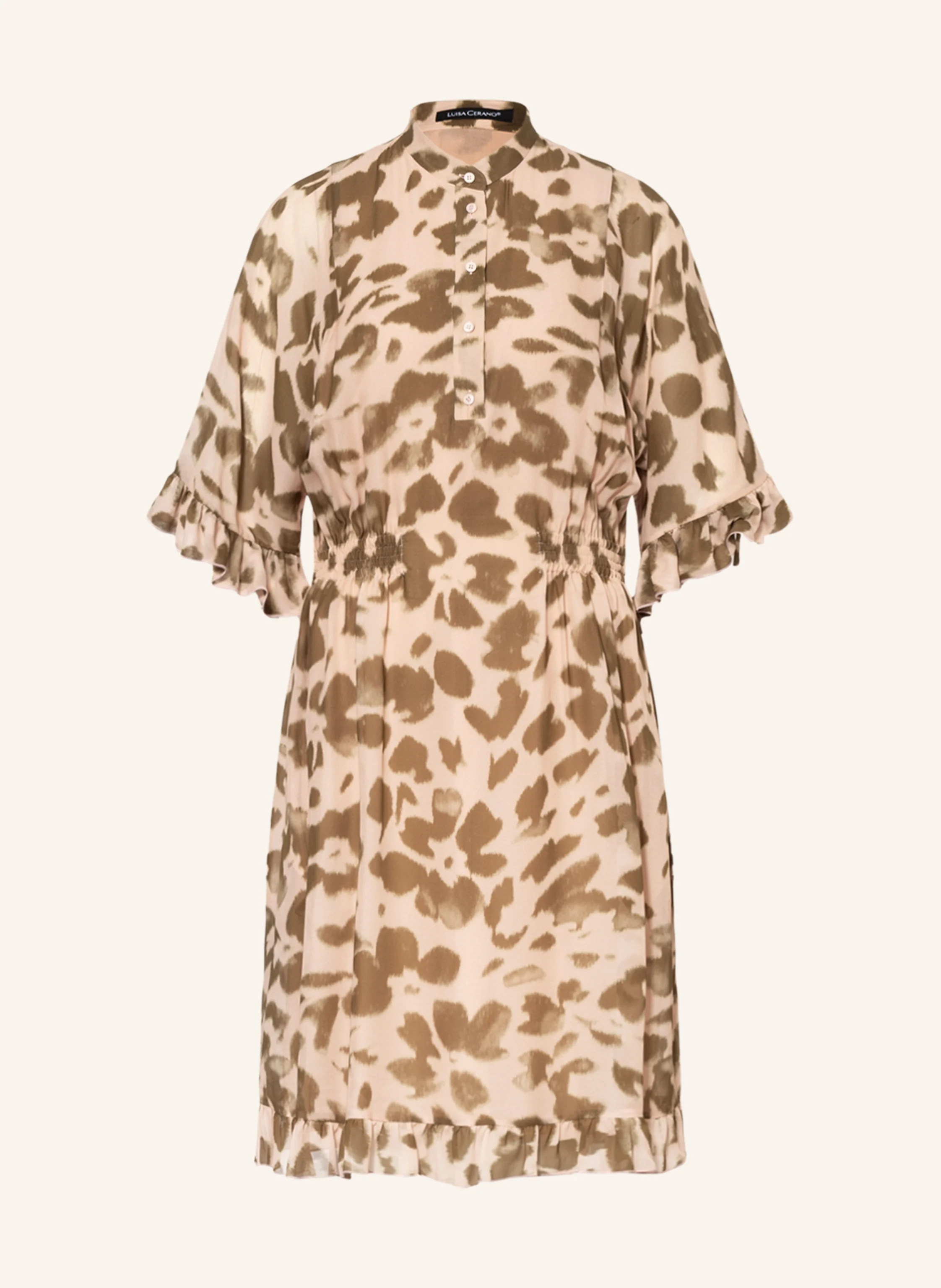Ta piękna sukienka Luisy Cerano prezentuje się z wyjątkowym wdziękiem i stylem. Jej krój jest dopasowany w talii, co podkreśla kobiecą sylwetkę, a stójka dodaje elegancji. Skrócona listwa guzikowa z przodu oraz guziki z masy perłowej tworzą subtelne i wyrafinowane wykończenie. Rękawy 3/4 są ozdobione falbankami na zakończeniach, co nadaje sukience lekkości i delikatności. Marszczone części na wysokości talii dodają charakteru, a wpuszczane kieszenie są zarówno praktyczne, jak i stylowe. Wykończenie z podszewką zapewnia wygodę noszenia.