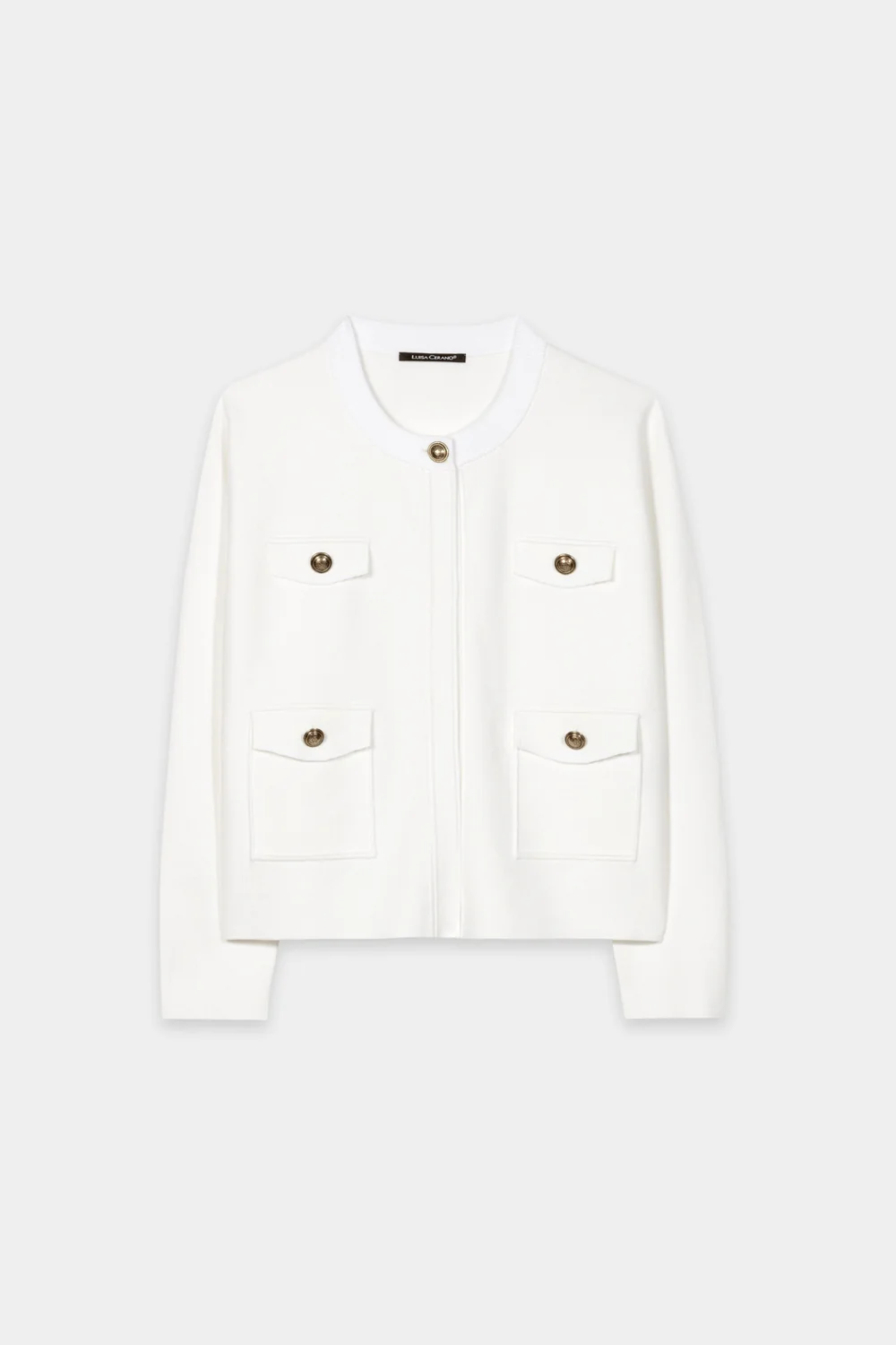 Kardigan zapinany jest na pojedynczy guzik przy dekolcie, co nadaje mu swobodny, ale uporządkowany charakter. Metalowe, ozdobne guziki stanowią subtelny detal podkreślający estetykę marki Luisa Cerano. Z przodu znajdują się dwie naszywane kieszenie oraz dwie kieszenie zaznaczone na wysokości piersi, które nadają całości lekko strukturalny wygląd.