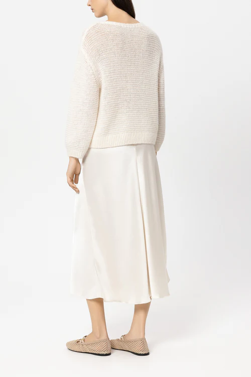 Długa, lekko ukośna satynowa spódnica Luisa Cerano zachwyca subtelnym połyskiem i elegancką linią, która miękko układa się na sylwetce. Sportowe zapięcie z przodu — na guzik, haftkę i zamek błyskawiczny — dodaje nowoczesnego charakteru, natomiast laserowo wykończony dół świadczy o precyzyjnym rzemiośle marki.