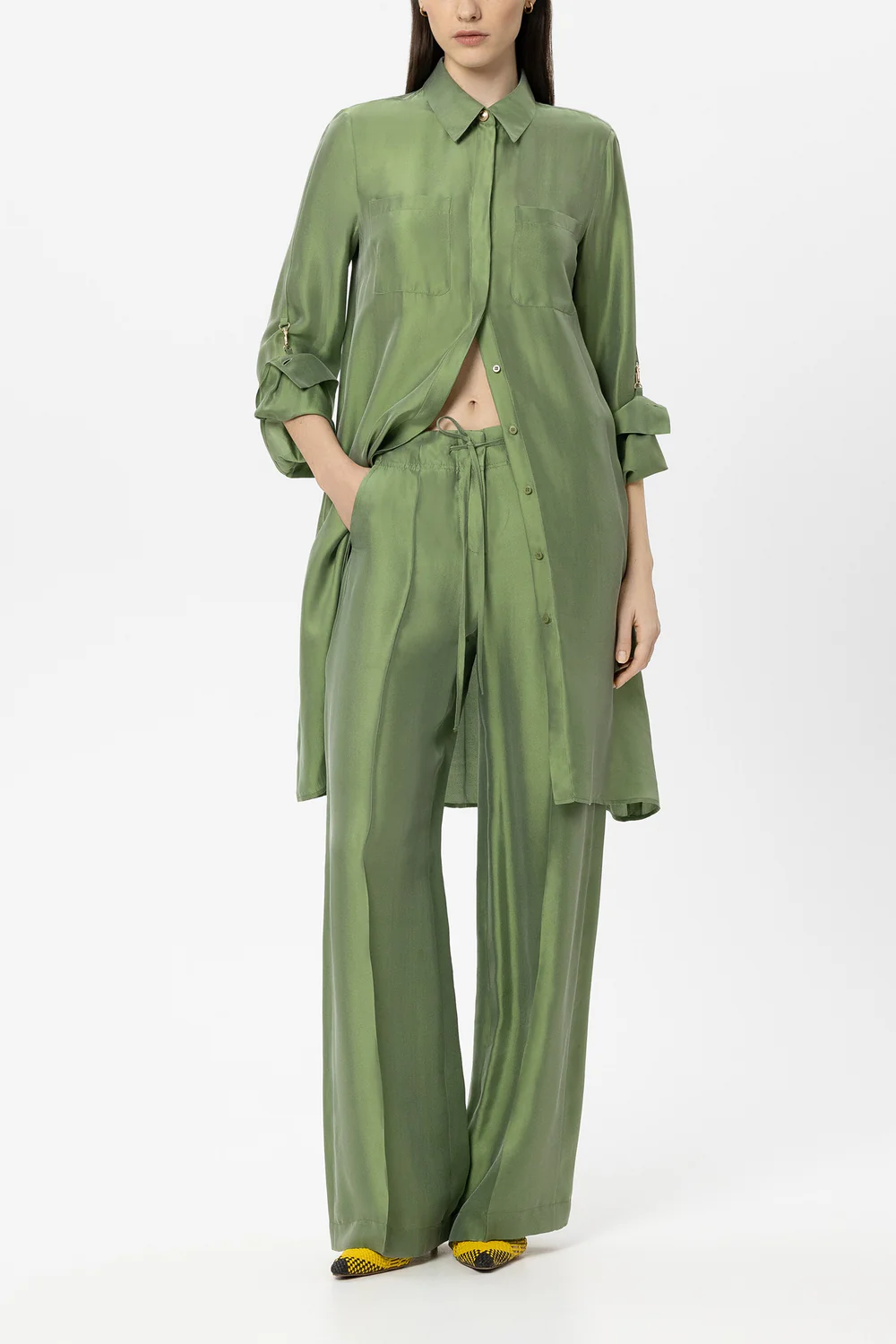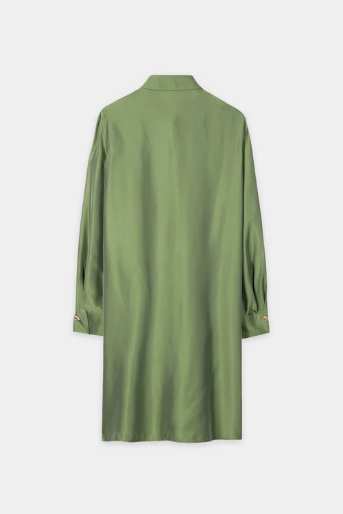 Lekko rozkloszowana sukienka koszulowa wykonana z elegancko opalizującej mieszanki jedwabiu przyciąga uwagę subtelnym połyskiem i dopracowaną formą. Tkanina jest lekka i przyjemna w noszeniu, a delikatny efekt opalizacji nadaje całości wyrafinowanego charakteru.