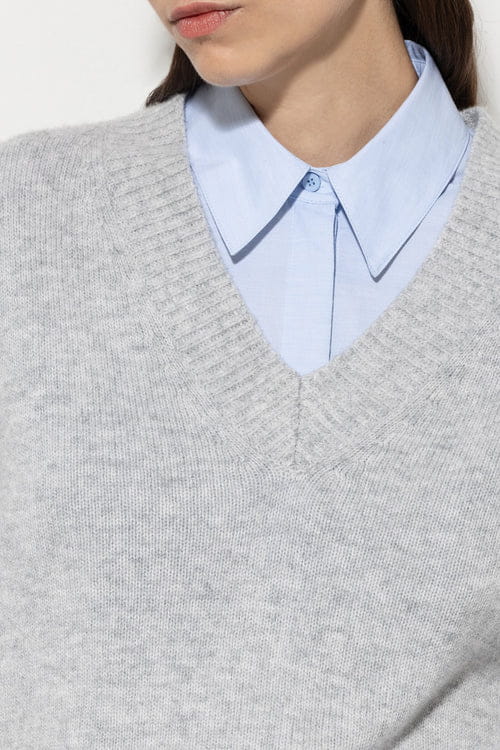 Odkryj elegancję i komfort z jasnoszarym swetrem Luisa Cerano, stworzonym z luksusowej mieszanki kaszmiru, która zapewnia miękkość i przyjemność noszenia. Ten wyjątkowy sweter wyróżnia się delikatnym dekoltem w kształcie litery V, który subtelnie podkreśla szyję i dodaje szyku.