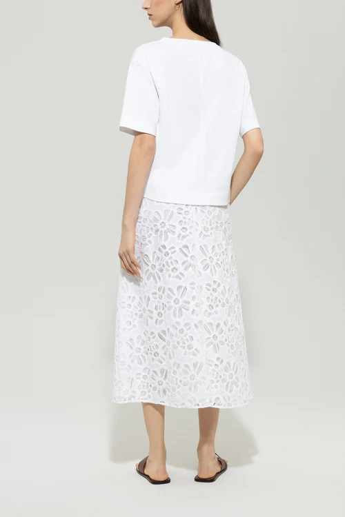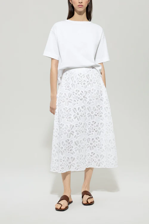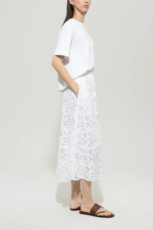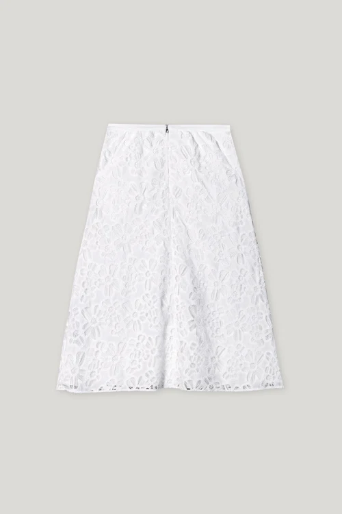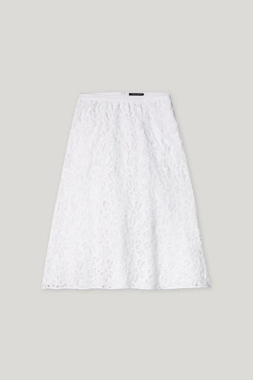 Długa, rozkloszowana spódnica z misterną szydełkową koronką wykonana z letniej bawełny. Pasek w talii można zapiąć z tyłu na zamek błyskawiczny i guzik, a w bocznym szwie ukryte są dwie kieszenie.
