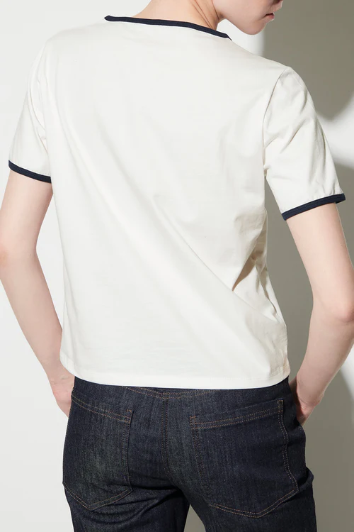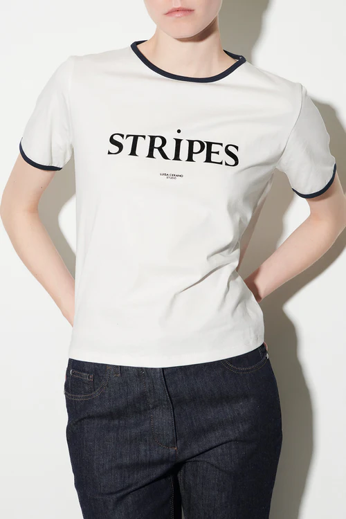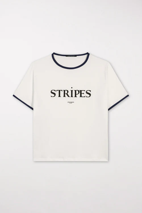 Dekolt i rękawy mają kontrastujące granatowe obszycia, a gumowany nadruk z napisem zdobi przód.