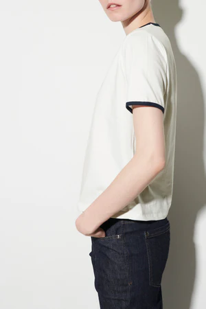 Klasyczna koszulka z okrągłym dekoltem wykonana z miękkiej tkaniny bawełnianej o lekko przyciętym kroju i wygodnej szerokości.