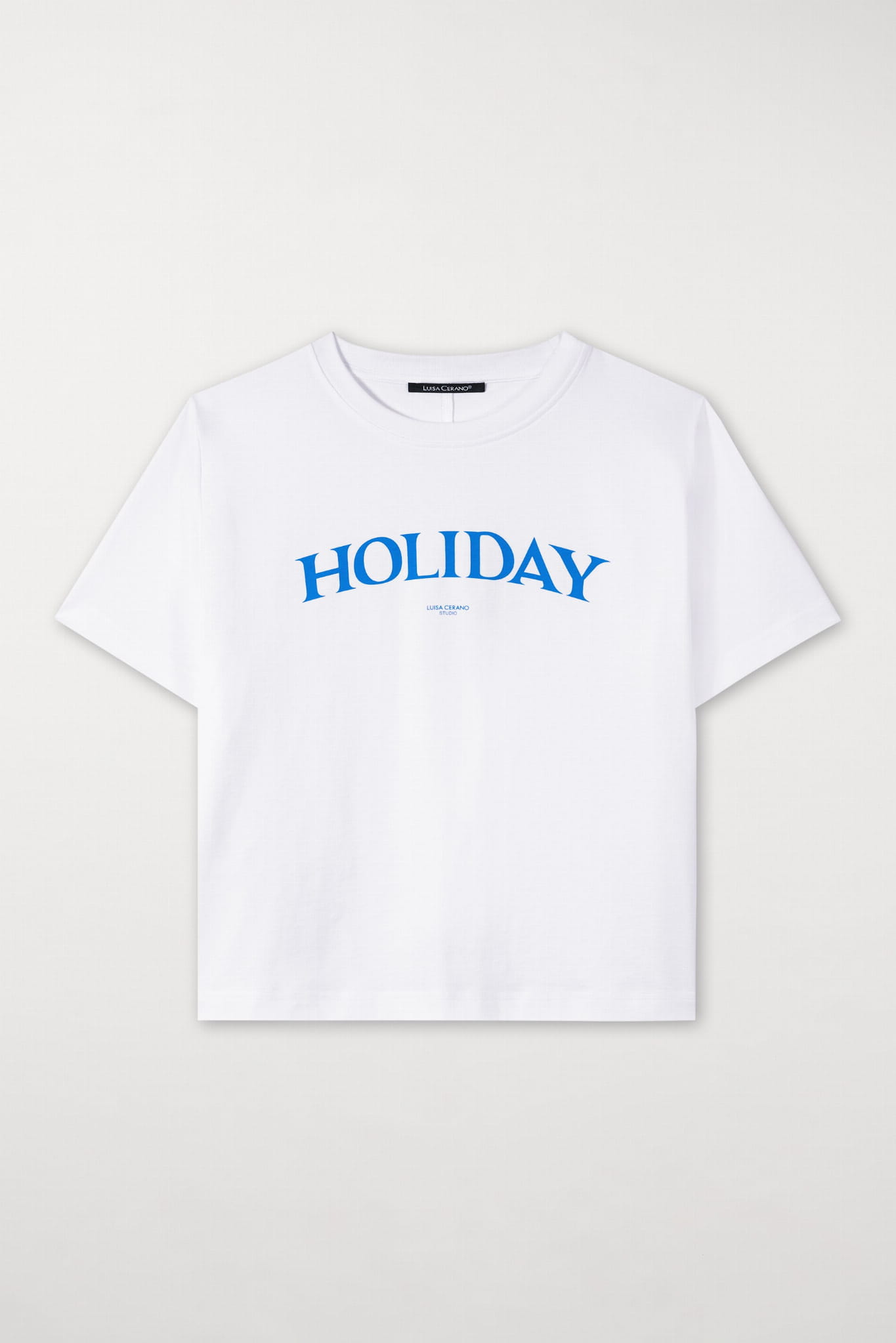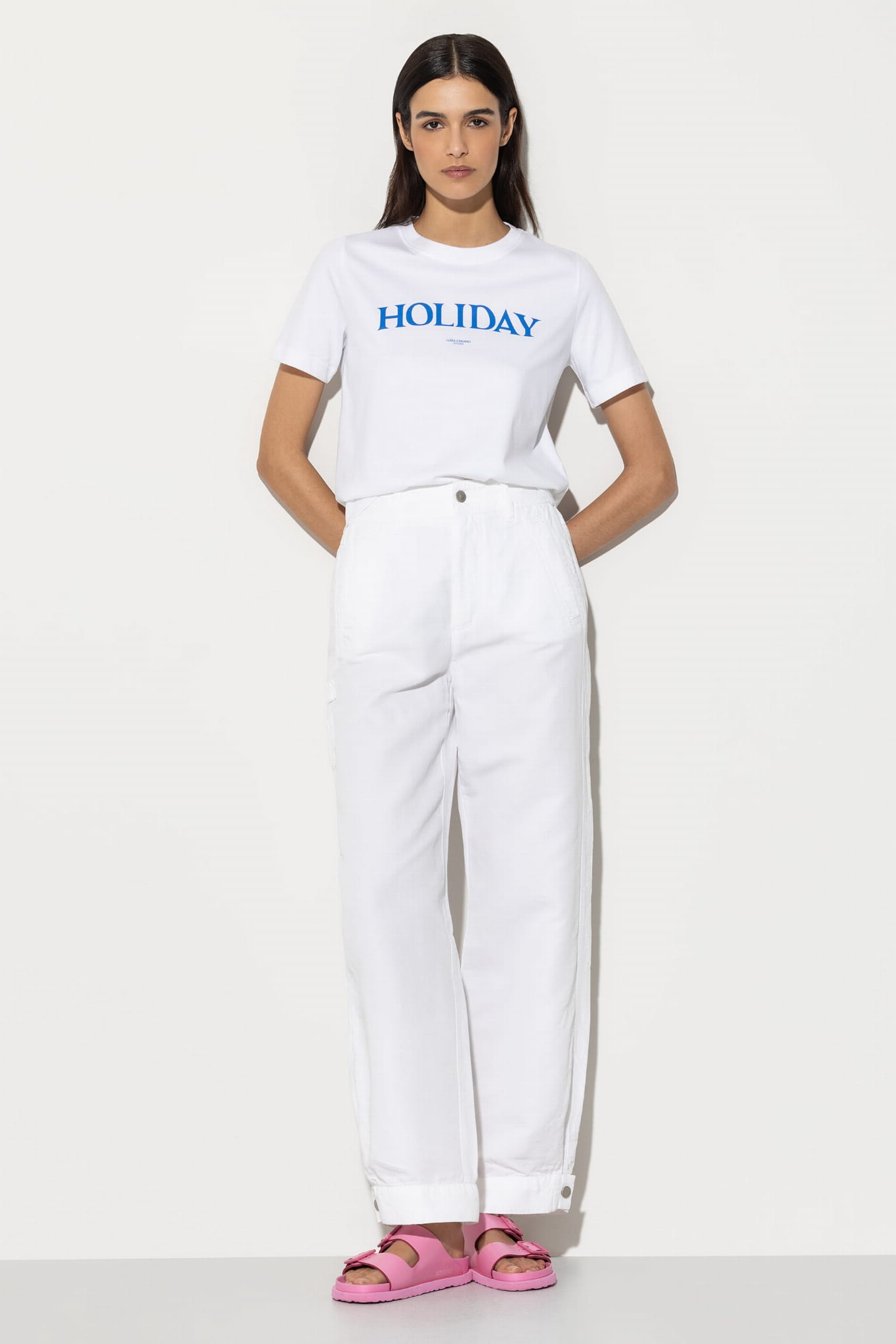 Biała koszulka Luisa Cerano wykonana z miękkiej bawełny organicznej to połączenie komfortu i stylu. Koszulka o swobodnym kroju posiada okrągły dekolt i charakterystyczny tylny szew. Na przodzie znajduje się niebieski nadruk "Holiday" oraz logo marki, co dodaje jej wyjątkowego charakteru. Idealna na co dzień, zapewnia wygodę i modny wygląd.
