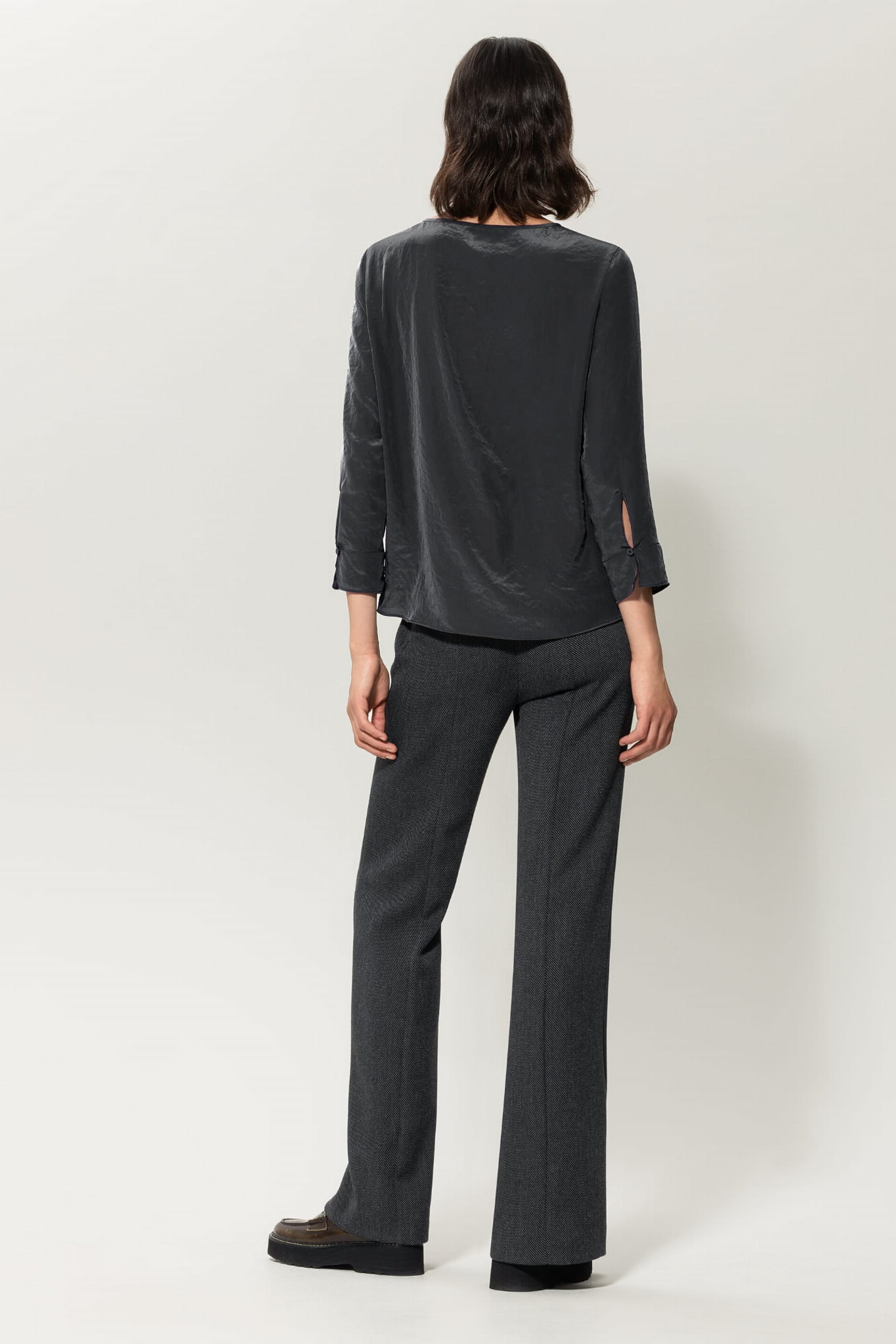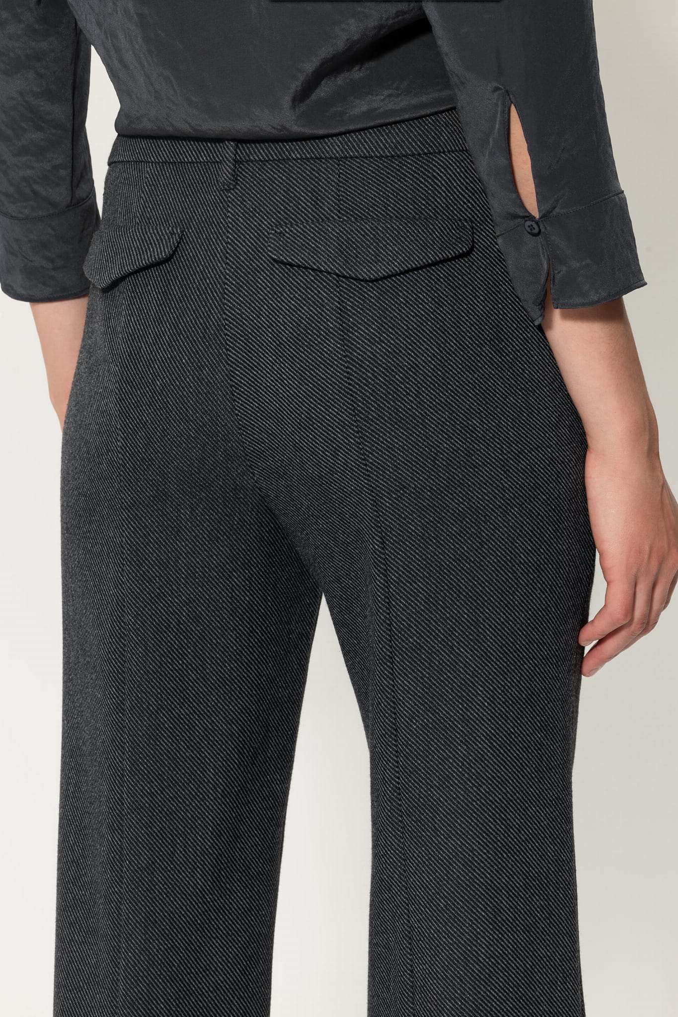 Przeszyty kant spodniom charakterystycznego wyglądu. Ich delikatnie rozkloszowany krój sprawia, że układają się one miękko i elegancko, podkreślając Twoją sylwetkę w najpiękniejszy sposób.
