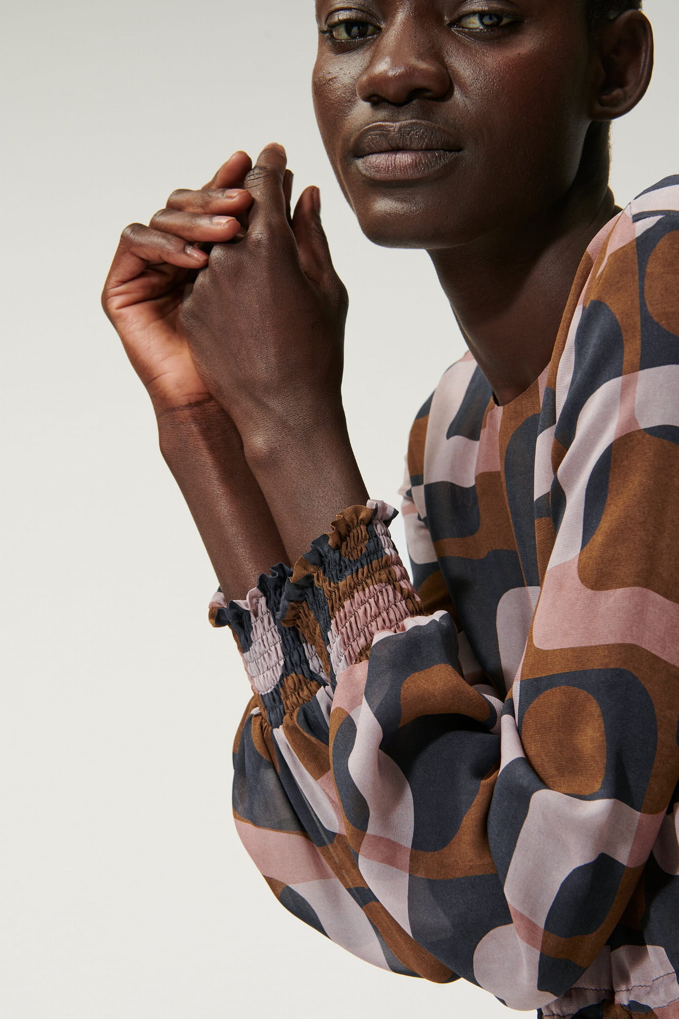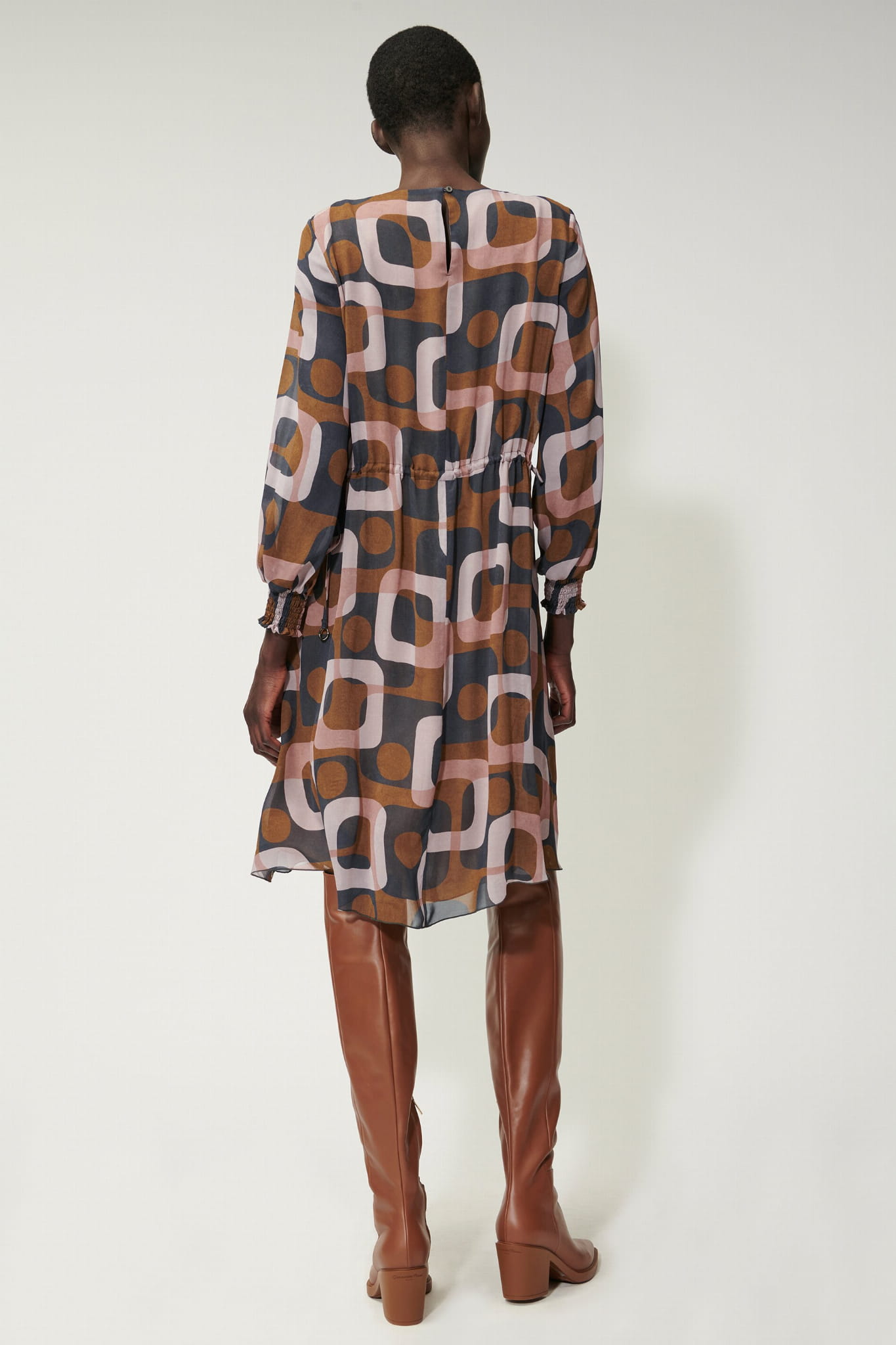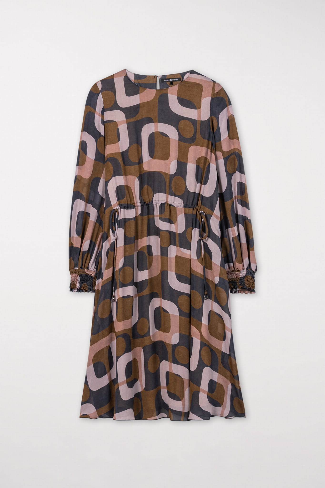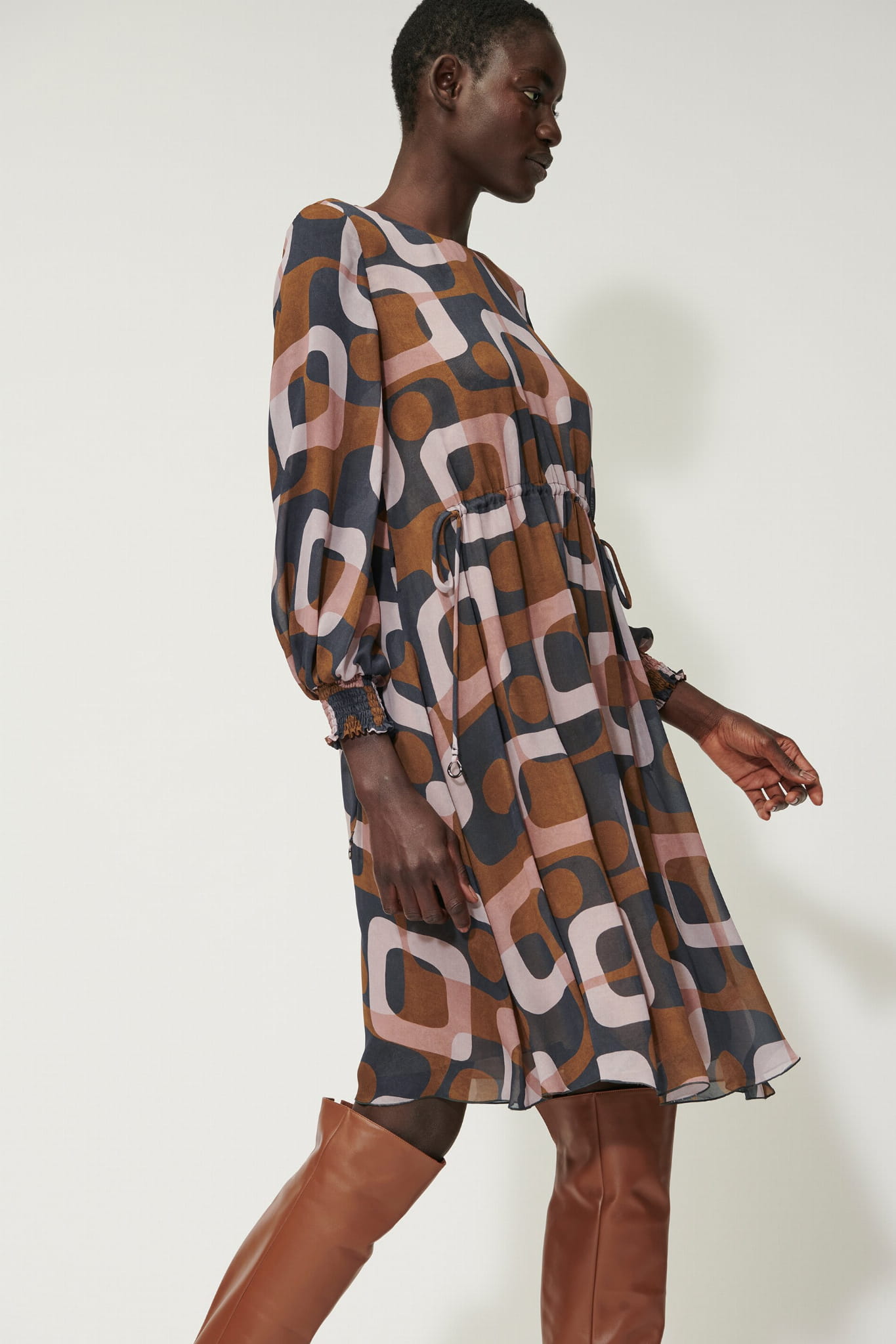 Luźna sukienka Luisa Cerano z cienkim paskiem w talii to połączenie wygody i elegancji. Jej geometryczny print dodaje jej niepowtarzalnego charakteru, podkreślając Twoją oryginalność i pewność siebie.