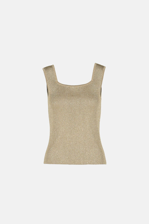 Złota bluzka bez rękawów LUISA SPAGNOLI wykonana z połyskującej dzianiny lureksowej, która pięknie odbija światło i podkreśla opaleniznę. Kwadratowy dekolt z przodu i z tyłu subtelnie eksponuje linię ramion oraz szyi, nadając stylizacji nowoczesnego, kobiecego charakteru.