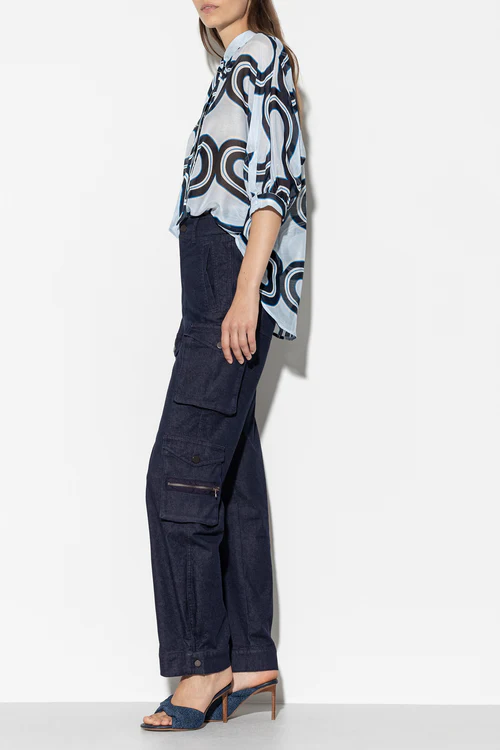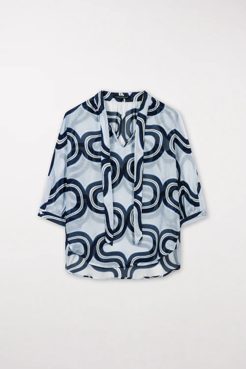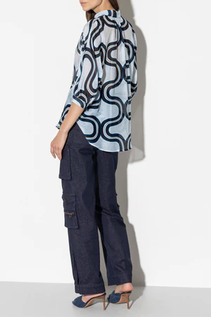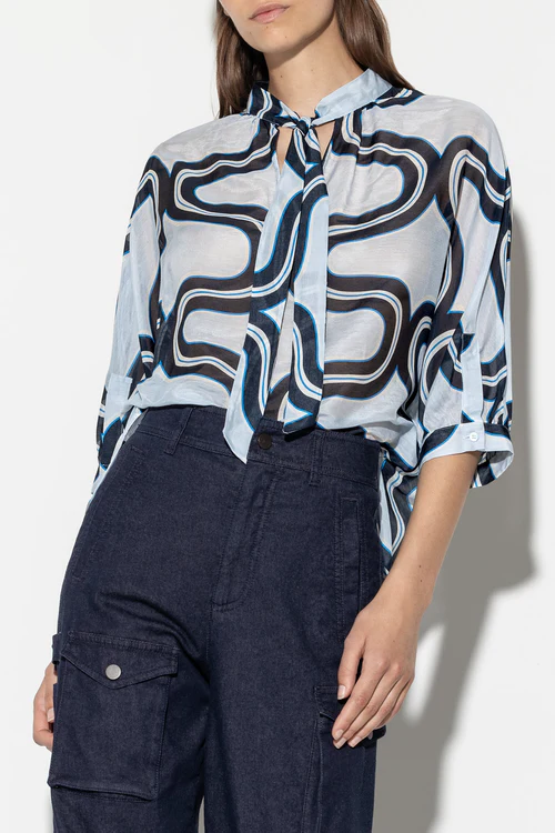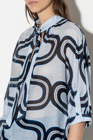 Prześwitująca bluzka kimono wykonana z delikatnego bawełniano-jedwabnego woalu z ekskluzywnym, inspirowanym grafiką wzorem w fale. Dekolt ma ozdobną patkę, a swobodne półrękawy zakończone są mankietem zapinanym na jeden guzik.